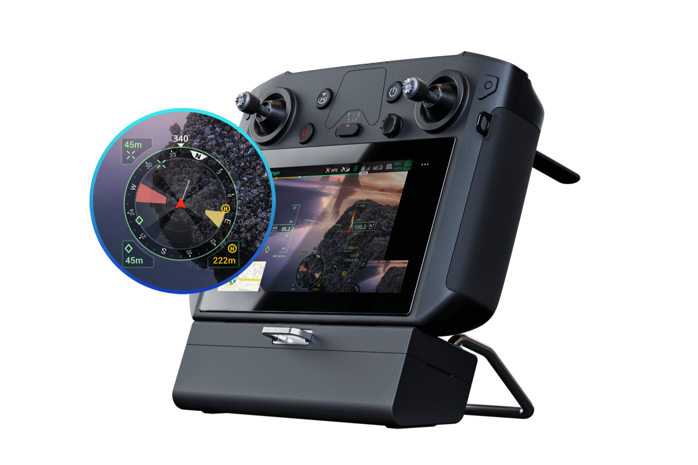 Piloții pot vizualiza, de asemenea, starea în timp real a direcției aeronavei, a traiectoriei, a informațiilor PinPoint și a proiecției punctului de origine, într-un mod mai eficient. Vizualizați simultan toate obstacolele din apropiere cu noua hartă a obstacolelor, astfel încât să puteți fi pe deplin informat.